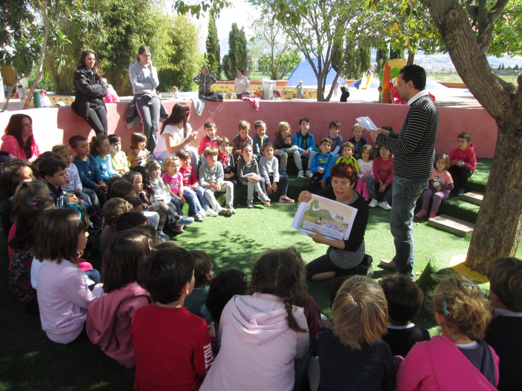 Escuchamos también una bonita historia de caballeros, princesas y dragones, que Jordi nos cuenta, como tradición en estas fechas y que a tod@s ha encantado. Como espacio hemos escogido el agradable rinconcito del árbol reunión, que tenemos en el parque exterior.