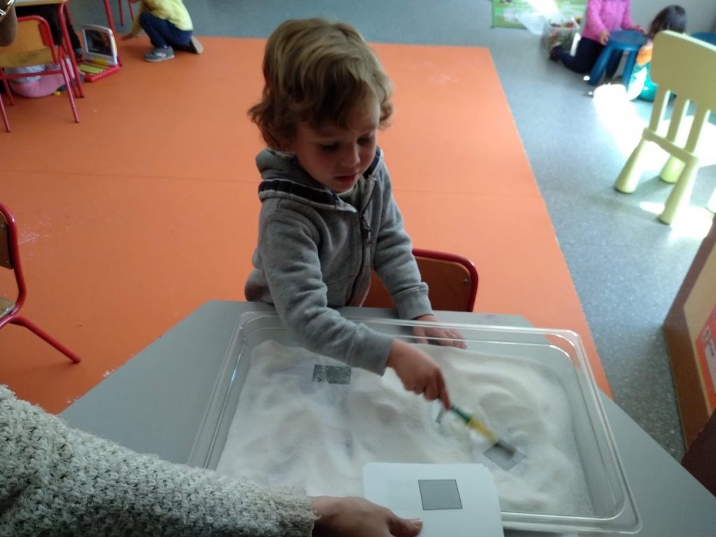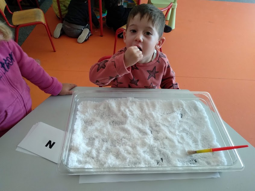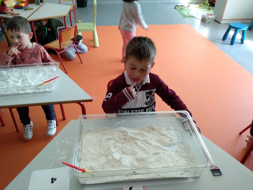 Debajo de cada bandeja colocamos un folio A3 con letras, números y formas geométricas. Al sentarse frente a la bandeja, debían probar el contenido y adivinar de que se trataba…muchos confundían la sal con el azúcar, en el caso de la harina decían «chuche», «dulce», «rico»,jajaja. Les ofrecemos un pincel y una cuartilla con la letra, número o forma que debían encontrar bajo la harina, azúcar o sal: