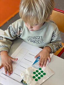 El grupo naranja escribe la carta para el Señor y la Señora Otoño. Como no cuentan con ordenador ni teléfono, preparamos una carta tradicional. Entre todos vamos decidiendo qué queremos incluir para invitarles a nuestra fiesta. Después decoramos la carta estampando nuestra huella dactilar con colores propios del otoño. Para ello, planteamos una pequeña consigna: de los cuatro colores, deben escoger uno por descarte; por ejemplo, no pueden elegir ni el amarillo, ni el verde, ni el naranja. Así trabajan la atención y la memoria para descubrir cuál es el color restante… y, en efecto, es el marrón.