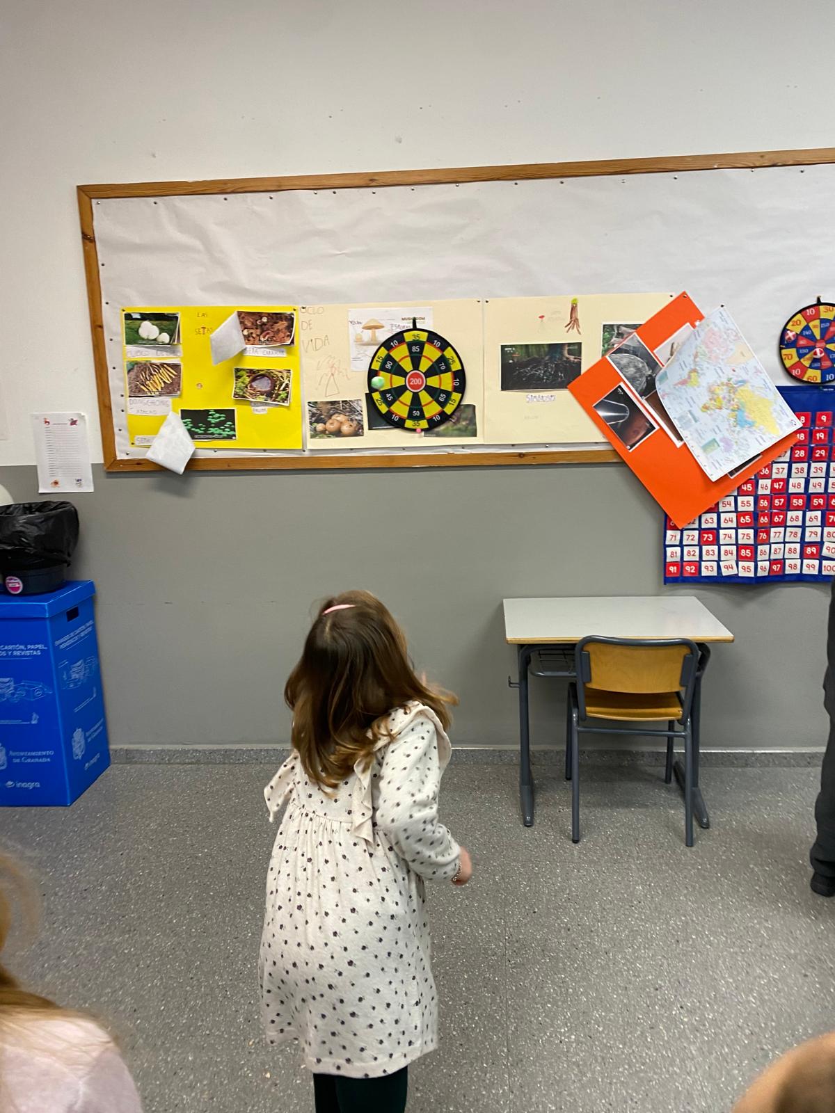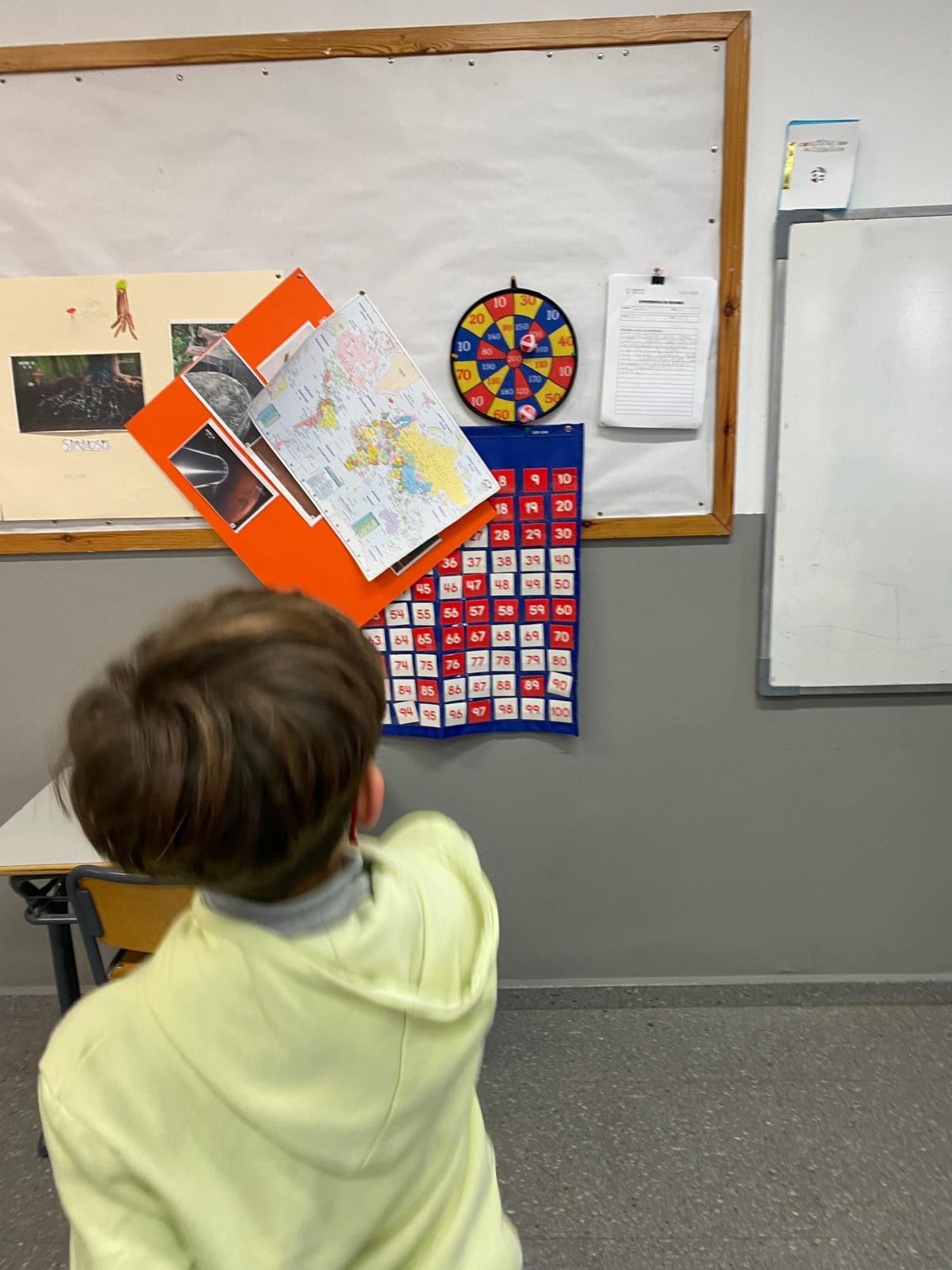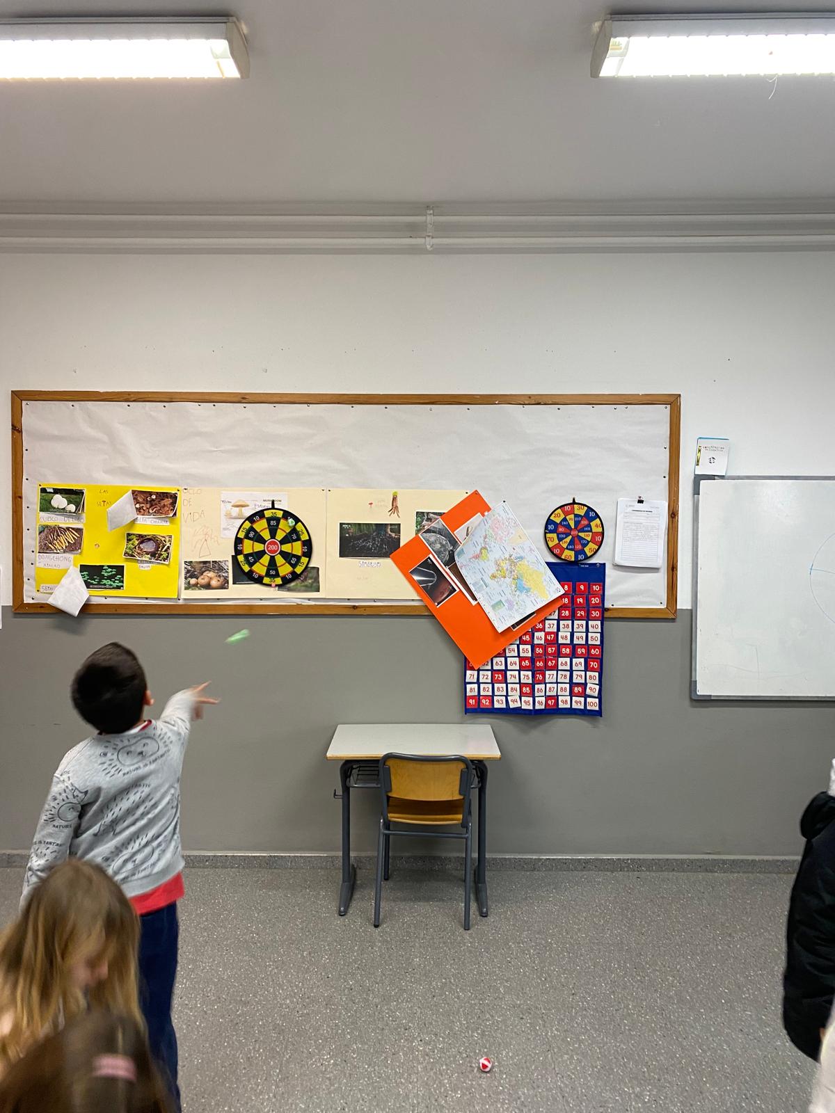 Hemos transformado la clase en un pequeño campo de lanzamiento. Colocamos la diana y lanzamos, apuntamos y sumamos. Detrás del juego se escondía el reto matemático de hacer operaciones varias además de dar significación de manera práctica a la importancia del cálculo.