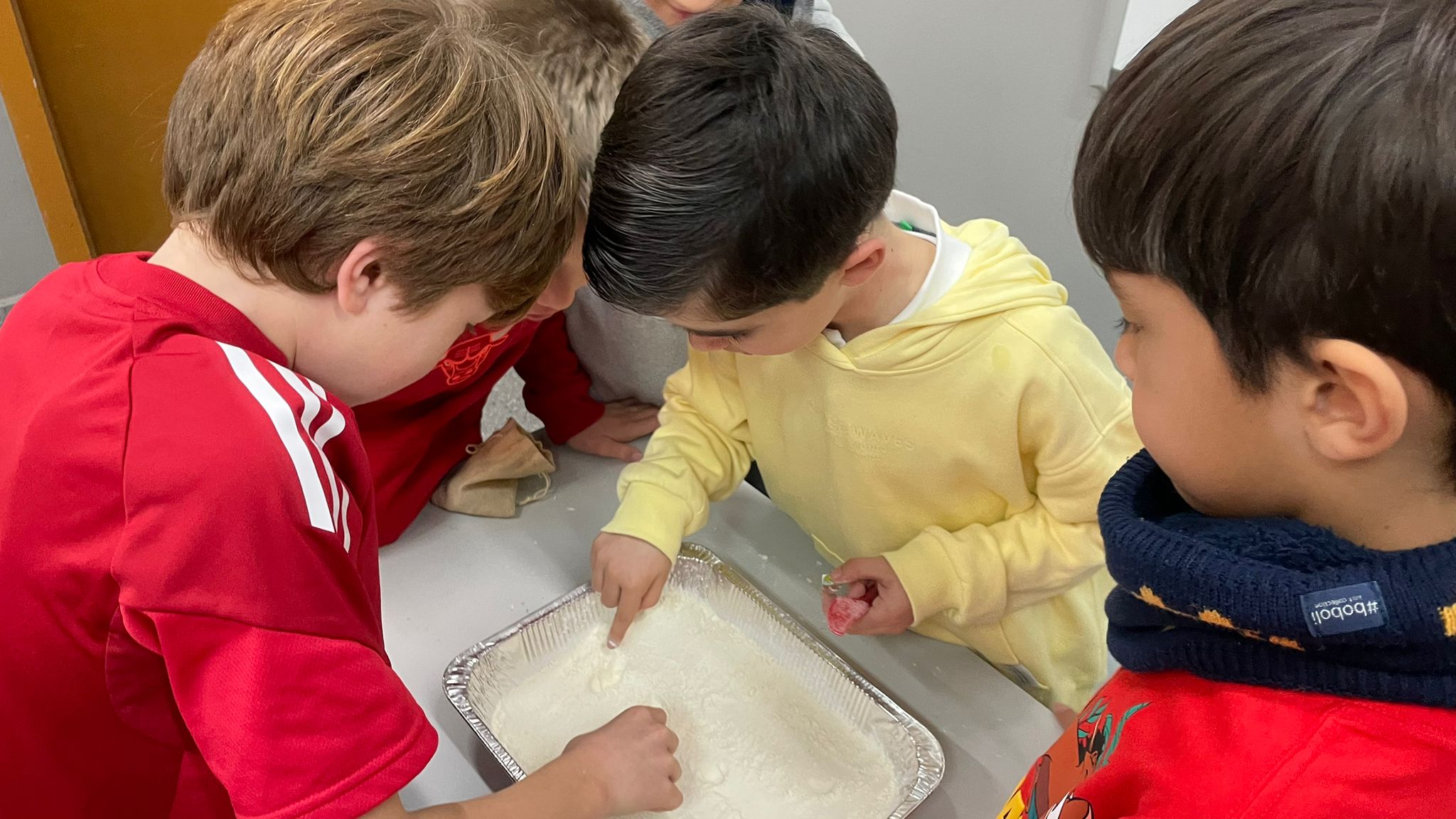 Utilizando un recipiente con harina y canicas, realizamos un simulacro del impacto de un meteorito en la superficie lunar. Al dejar caer las canicas desde diferentes alturas, observamos cómo variaba la forma del cráter: cuanto mayor era la altura o la fuerza del golpe, más amplia y profunda era la huella que quedaba en la harina. Este experimento nos permitió ver con claridad lo que ocurre cuando un objeto del espacio choca contra la Luna.