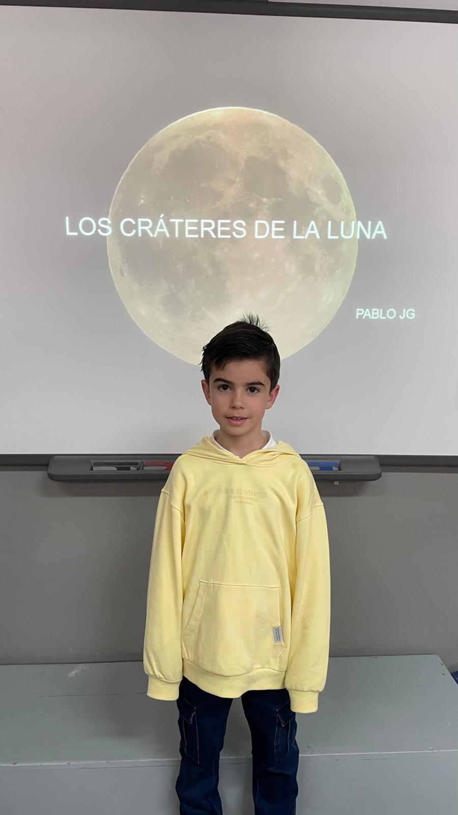 Pablo centró su exposición en los cráteres de la Luna. Nos explicó qué son, cómo se originan a partir del impacto de meteoritos y por qué su forma y tamaño pueden variar tanto. Descubrimos que algunos de ellos tienen millones de años y que incluso desde la Tierra podemos identificar algunos con telescopios.