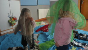 Continuamos con otra actividad con grandes telas y pañuelos que cubren el suelo de la clase y con los que trabajamos con los sentidos… ¡ Muchos colores y texturas con los que investigar!